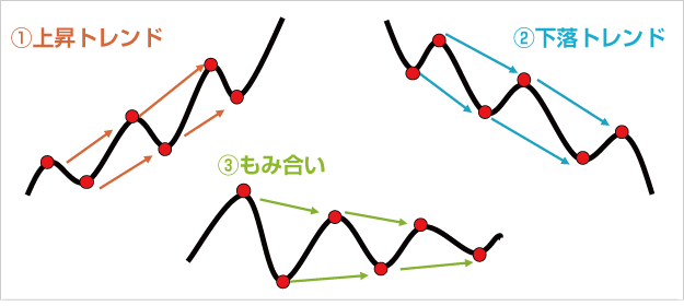 株価チャートを見ることで、トレンド(株価の方向性)がわかります。トレンドには、①上昇トレンド、②下落トレンド、③ボックストレンド(もみ合い)の3つがあります。上昇トレンドのときに買うことを順張り(じゅんばり)、下落トレンドのときに買うことを逆張り(ぎゃくばり)と言います。初心者のうちは、上昇トレンドに乗る順張りがおすすめです。