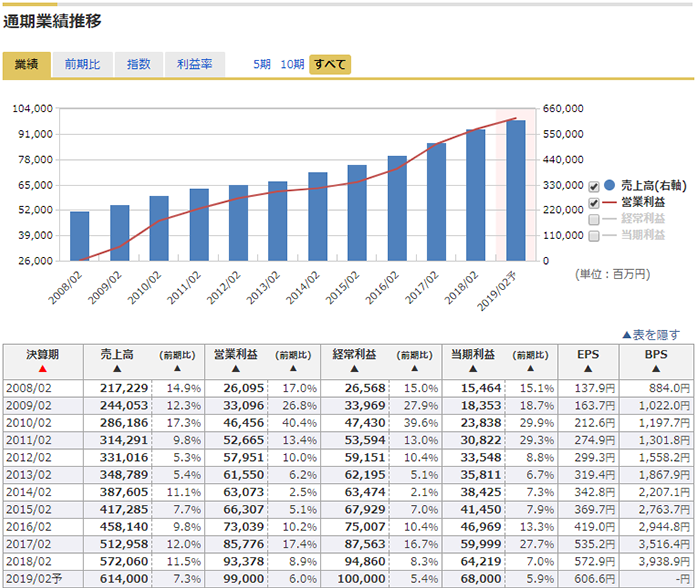 長期間通して業績推移を確認できるので、より長期スパンでの成長度合がひと目でわかります。