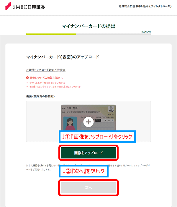 『画像をアップロード』をクリックして、パソコンに準備した本人確認書類の画像(表)を選択してアップロードしてください。